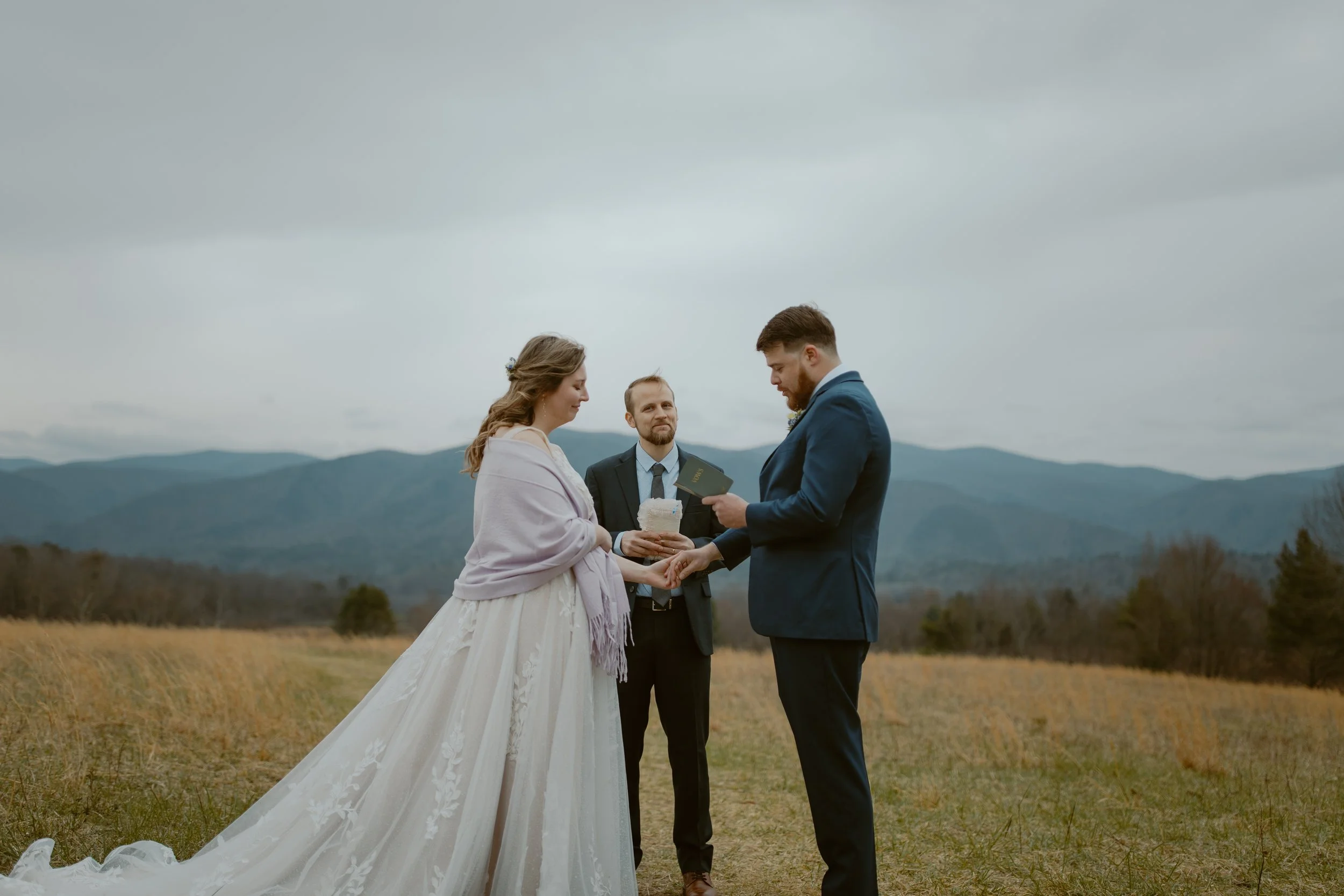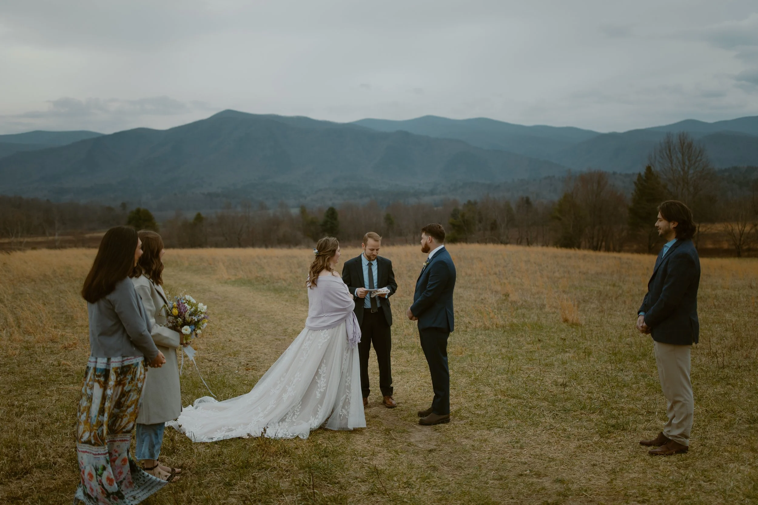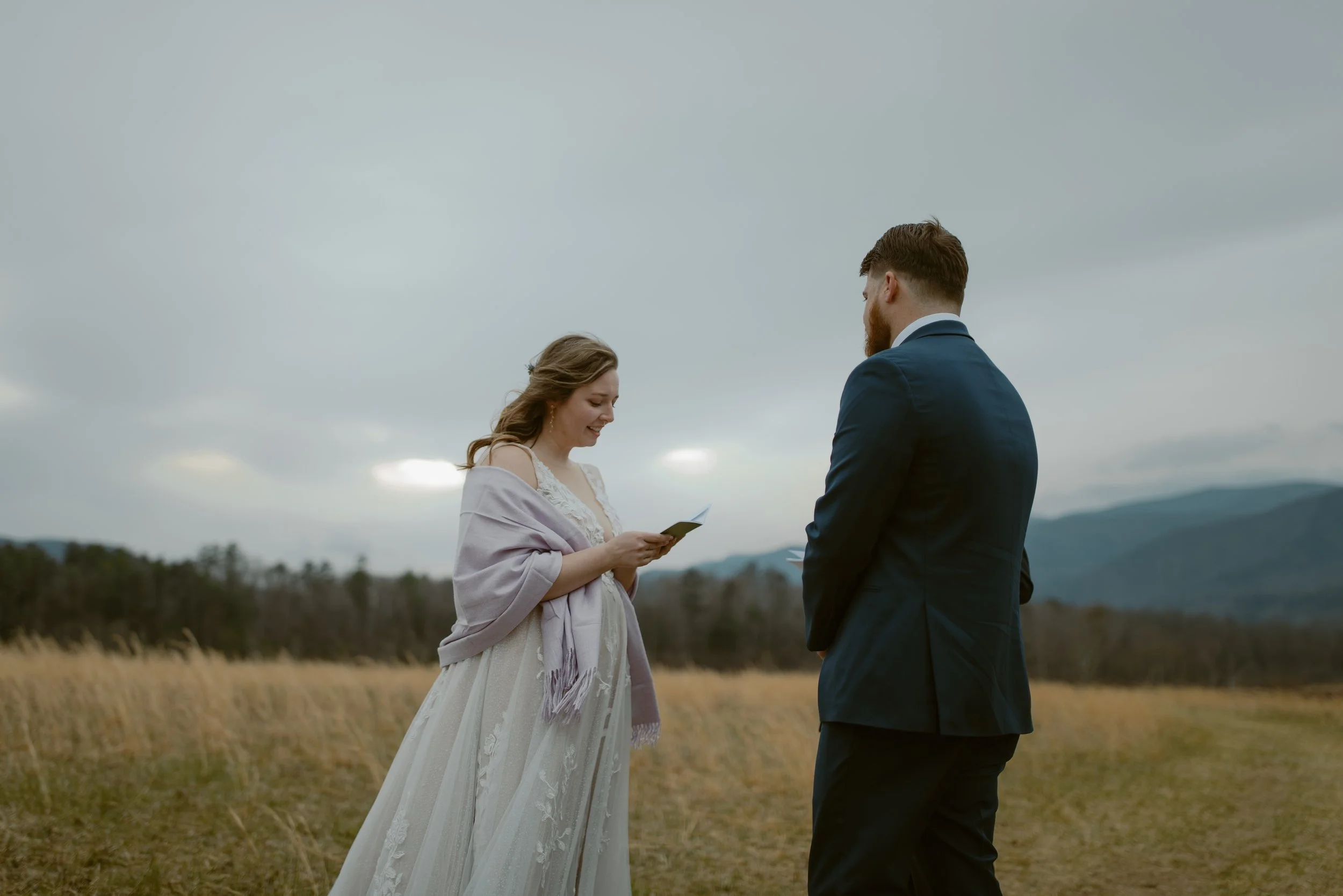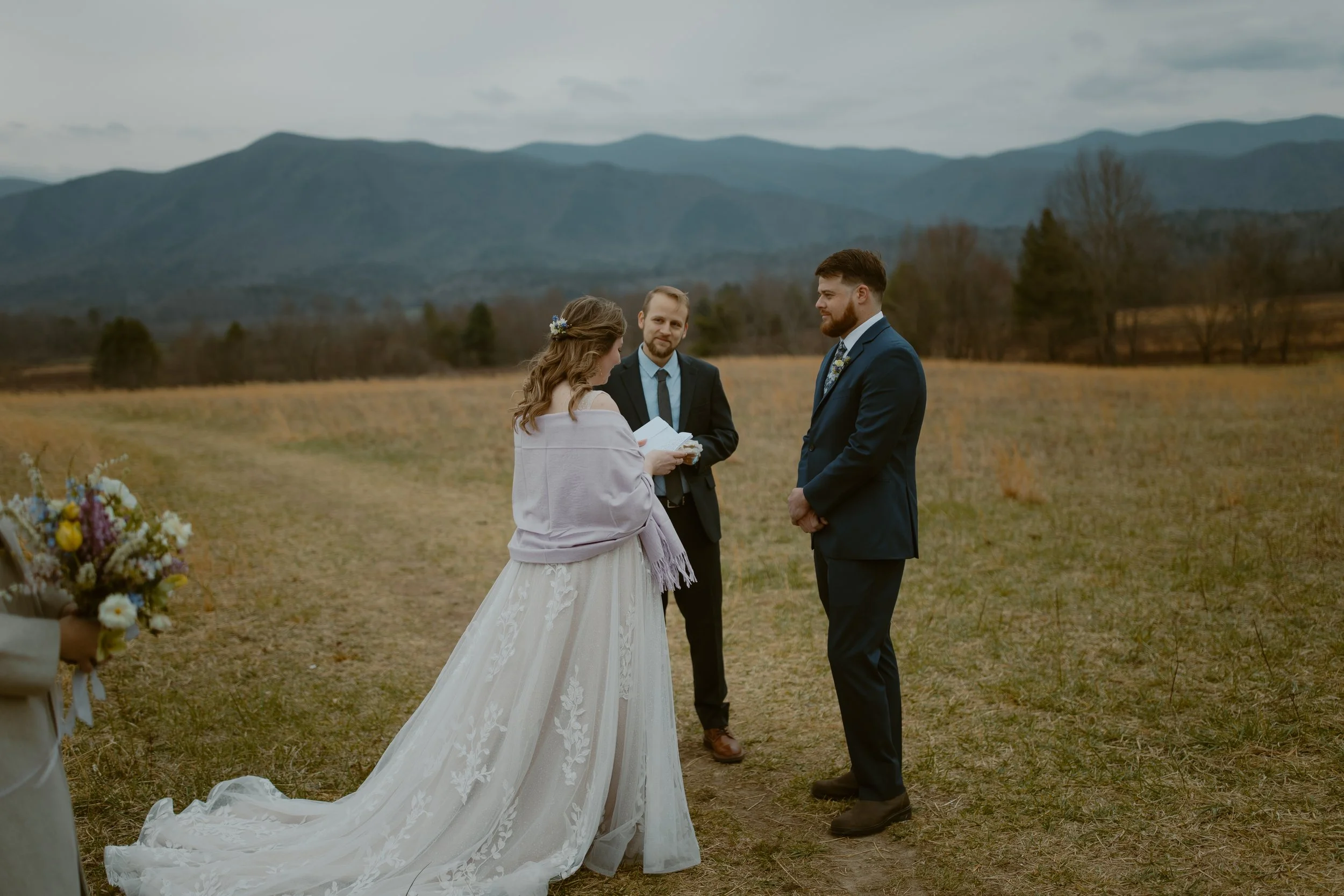They chose a sunrise ceremony, and even though the morning was cloudy, it was incredibly peaceful with hardly anyone around (honestly, sunrise is the best time to visit Cades Cove if you’re looking for that calm, intimate vibe). They had a cute first look at their ceremony spot. m ,n bOne of their friends gave the sweetest little speech before they exchanged vows, and since we handled their marriage license, it made it so easy for them to include a friend to lead their ceremony.