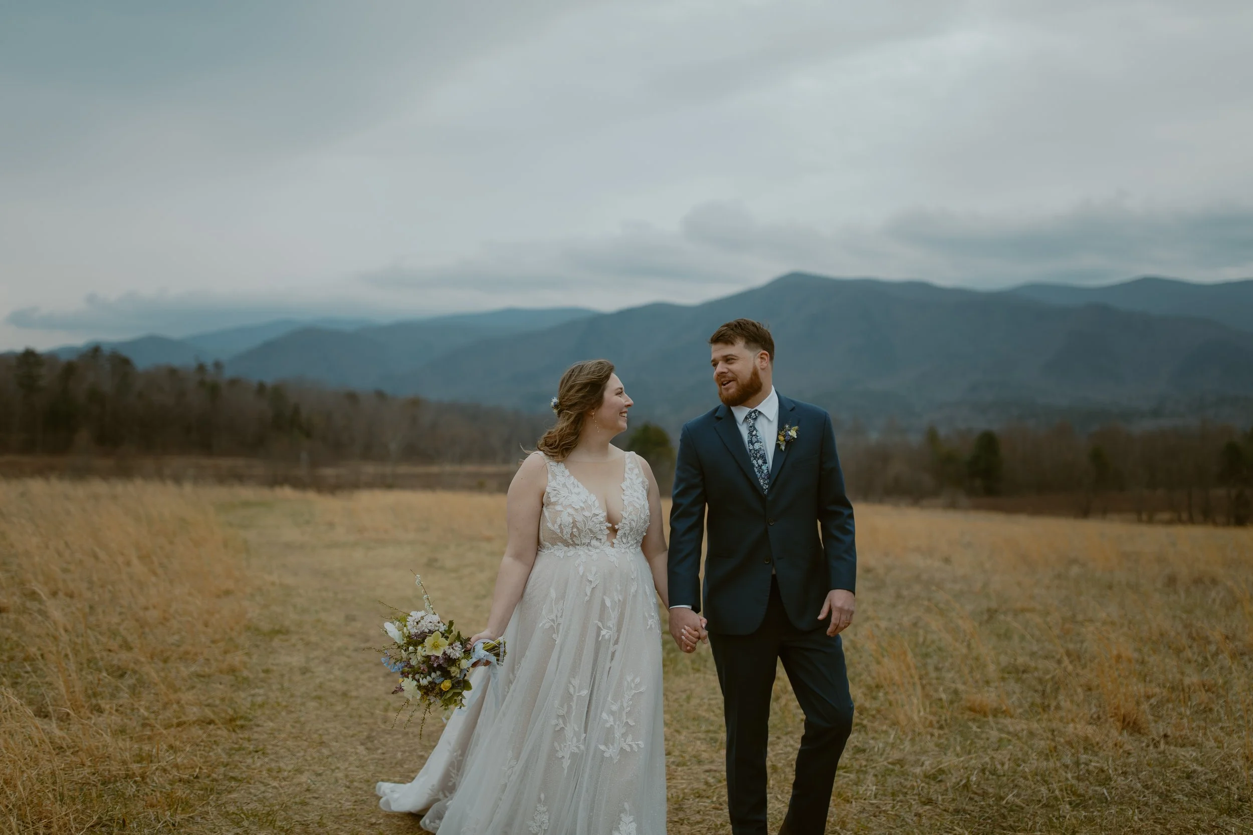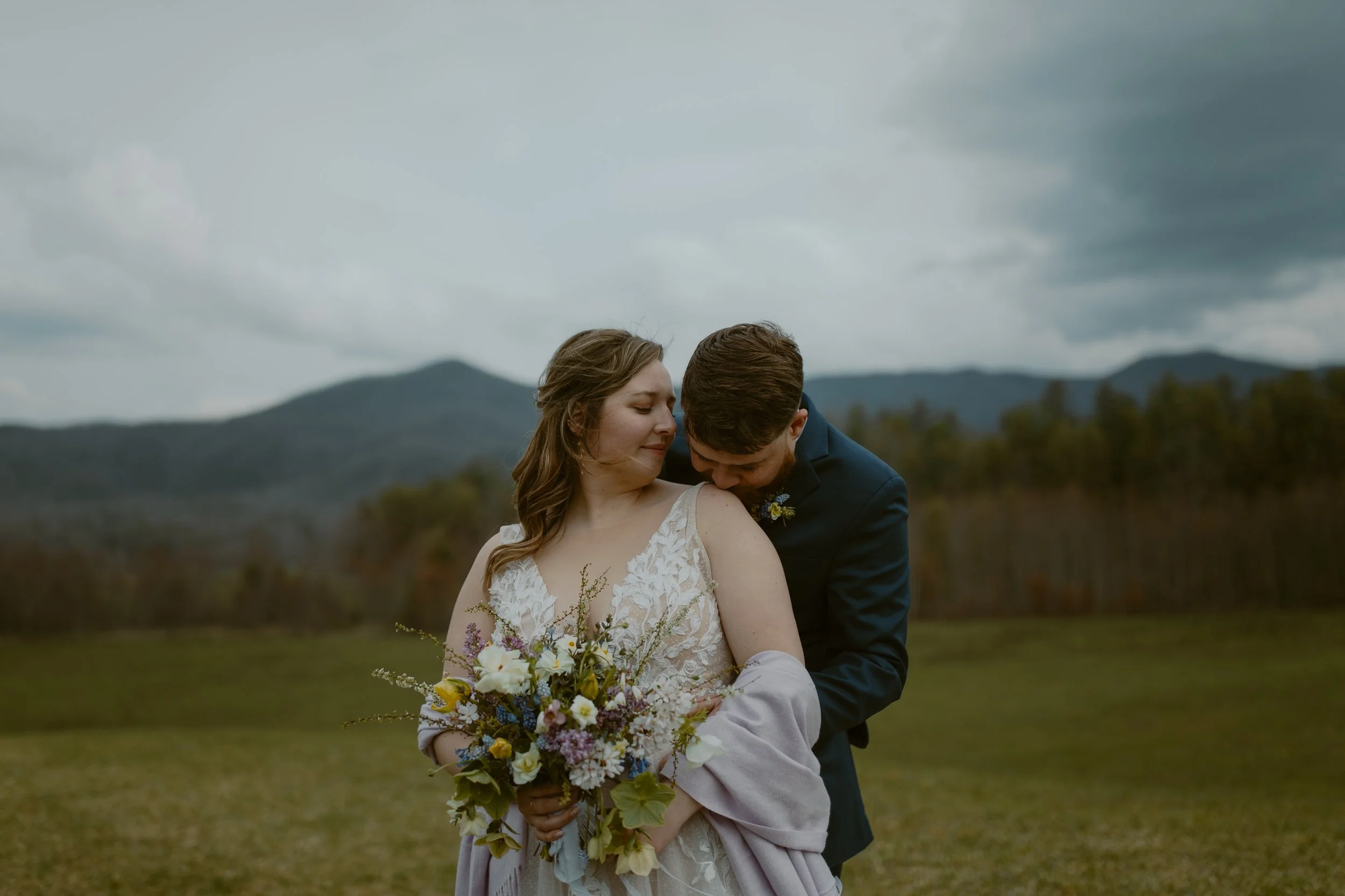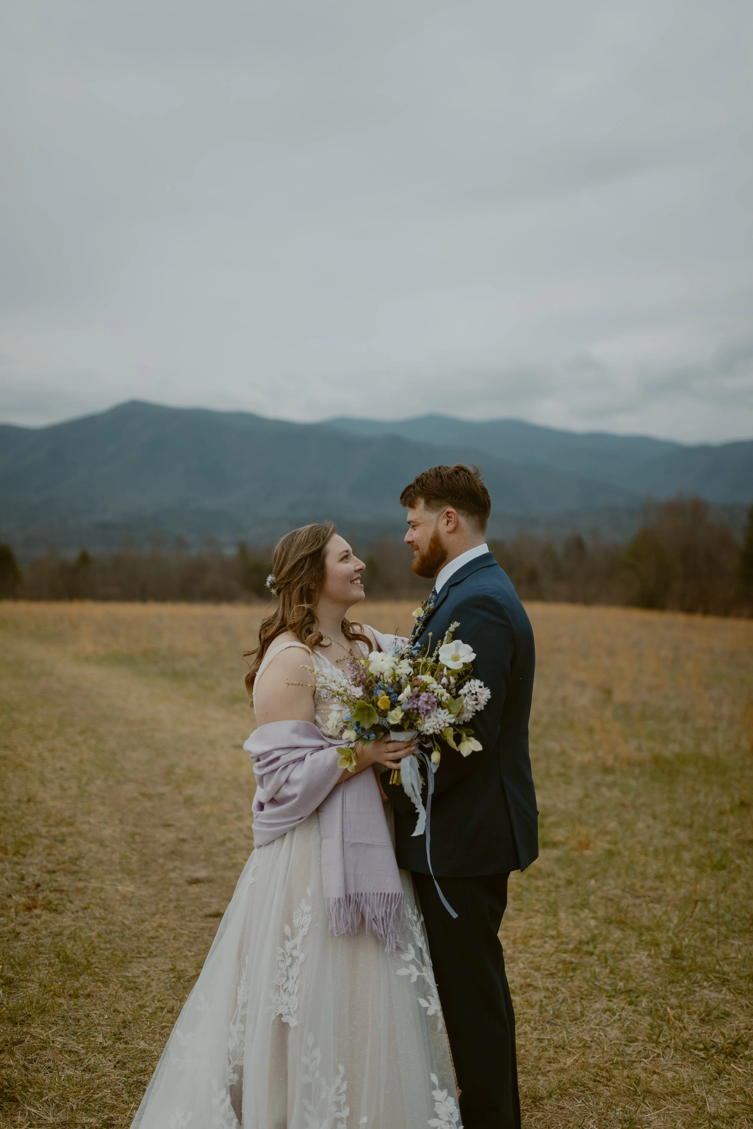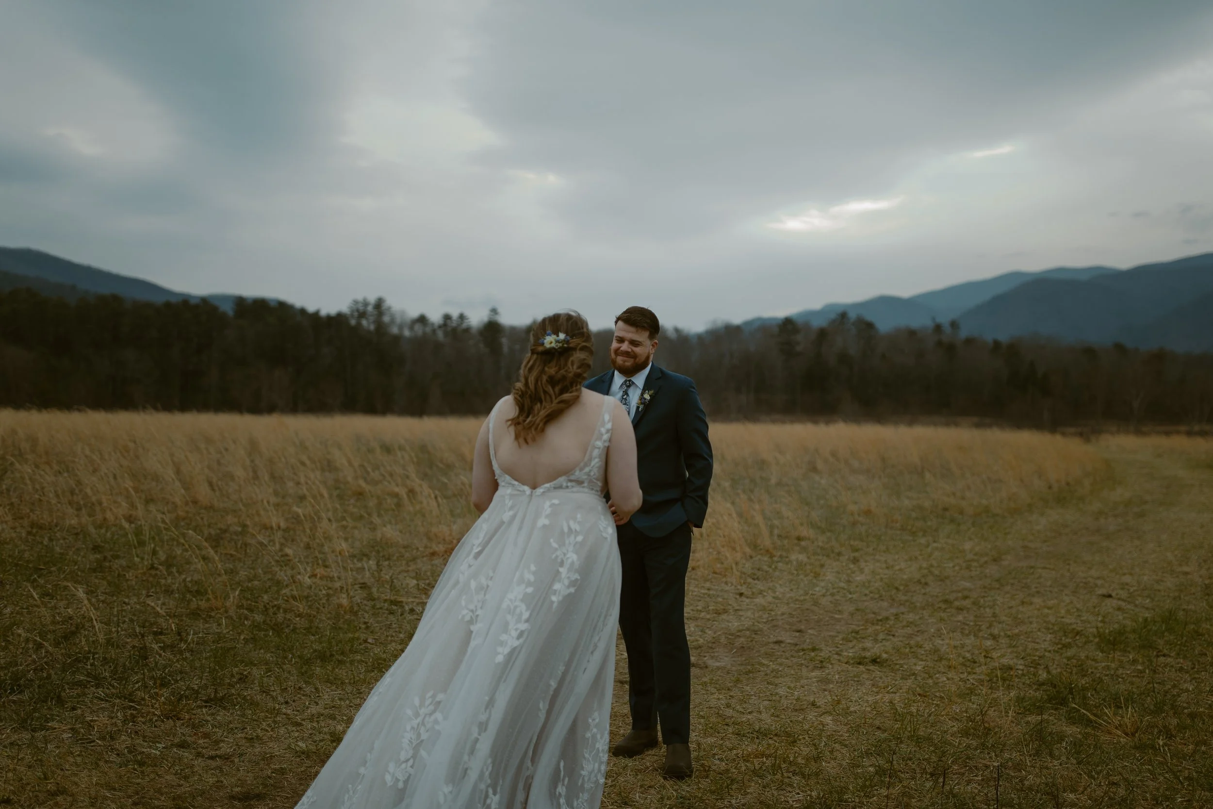 They chose a sunrise ceremony, and even though the morning was cloudy, it was incredibly peaceful with hardly anyone around (honestly, sunrise is the best time to visit Cades Cove if you’re looking for that calm, intimate vibe). They had a cute first look at their ceremony spot. m ,n bOne of their friends gave the sweetest little speech before they exchanged vows, and since we handled their marriage license, it made it so easy for them to include a friend to lead their ceremony.