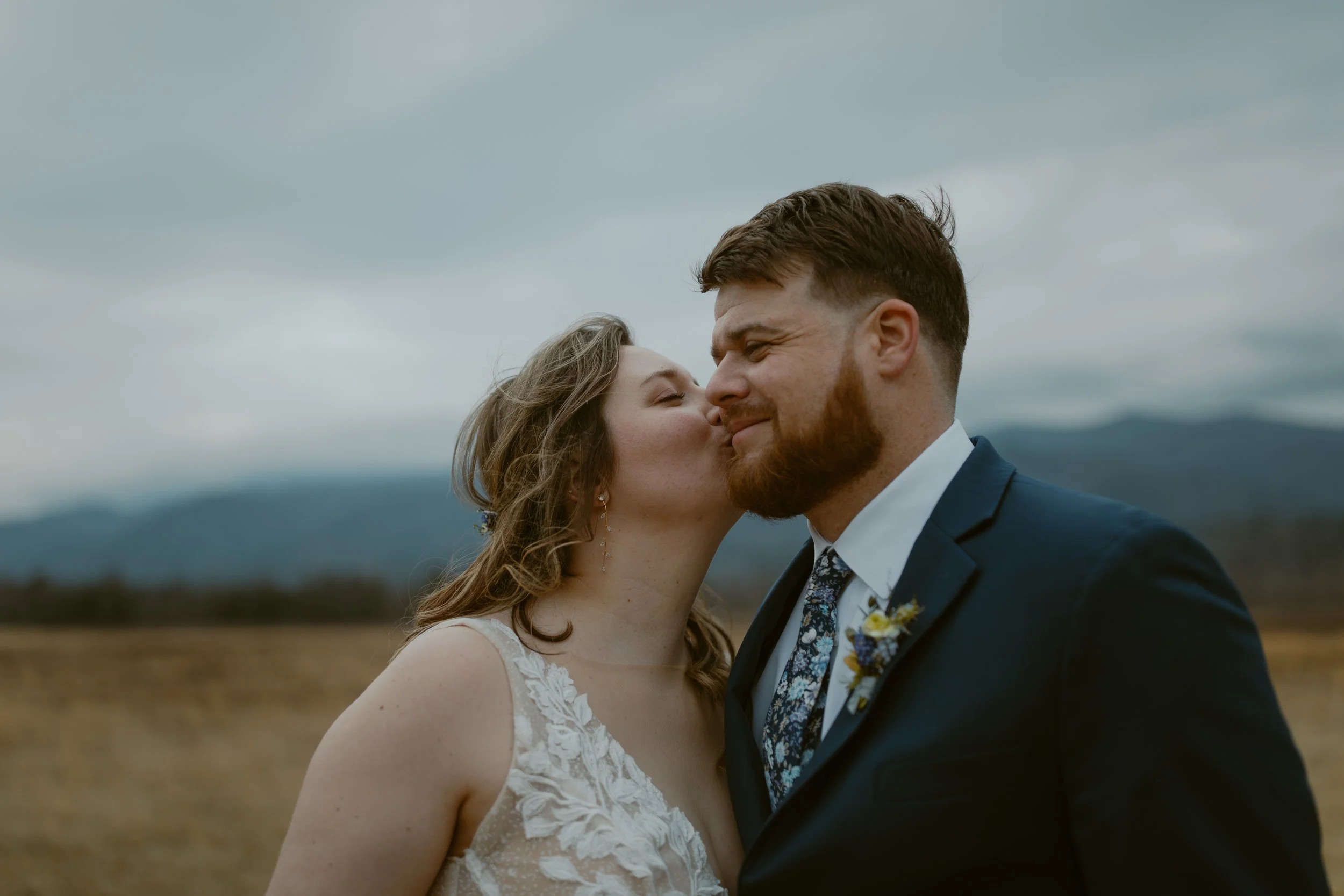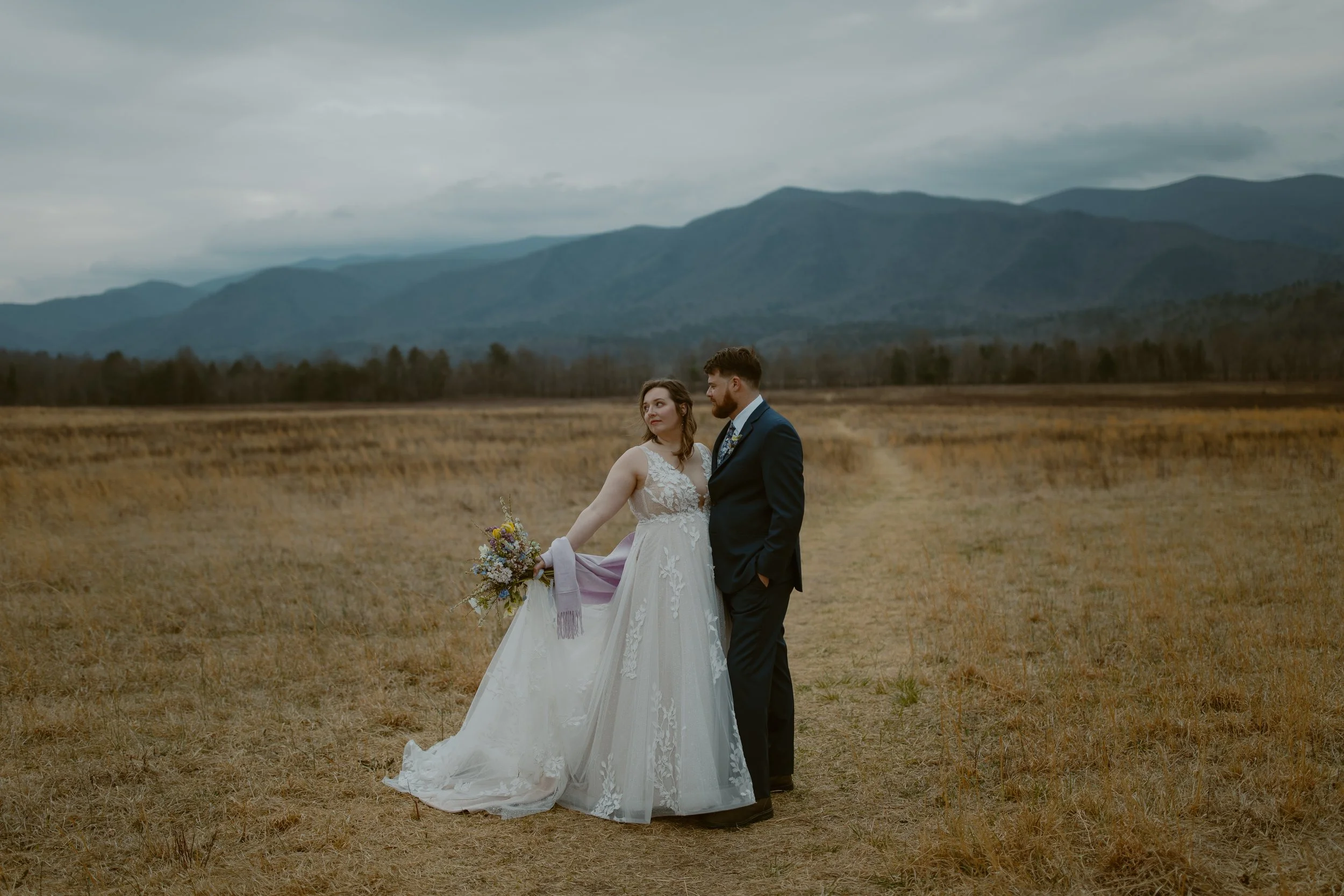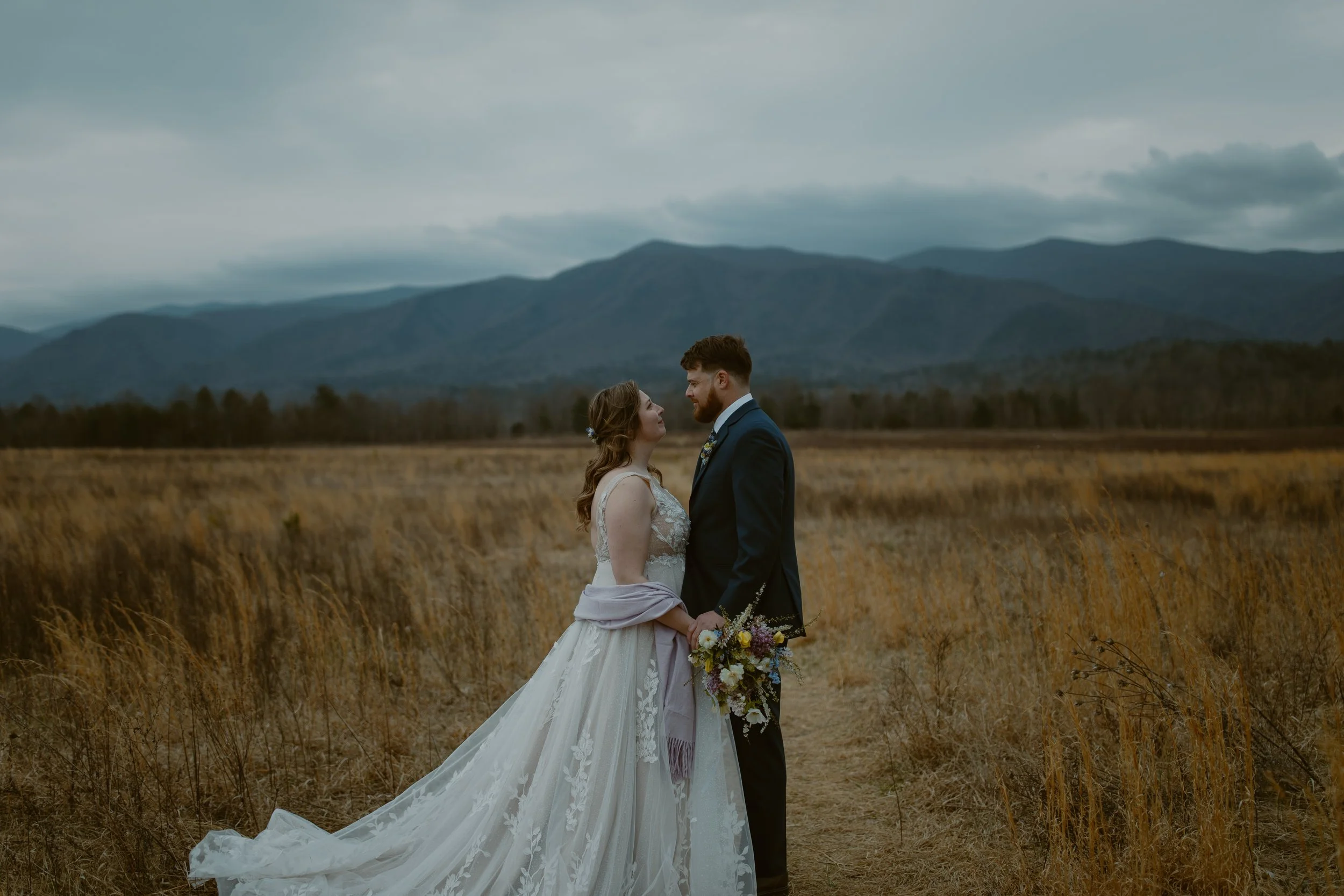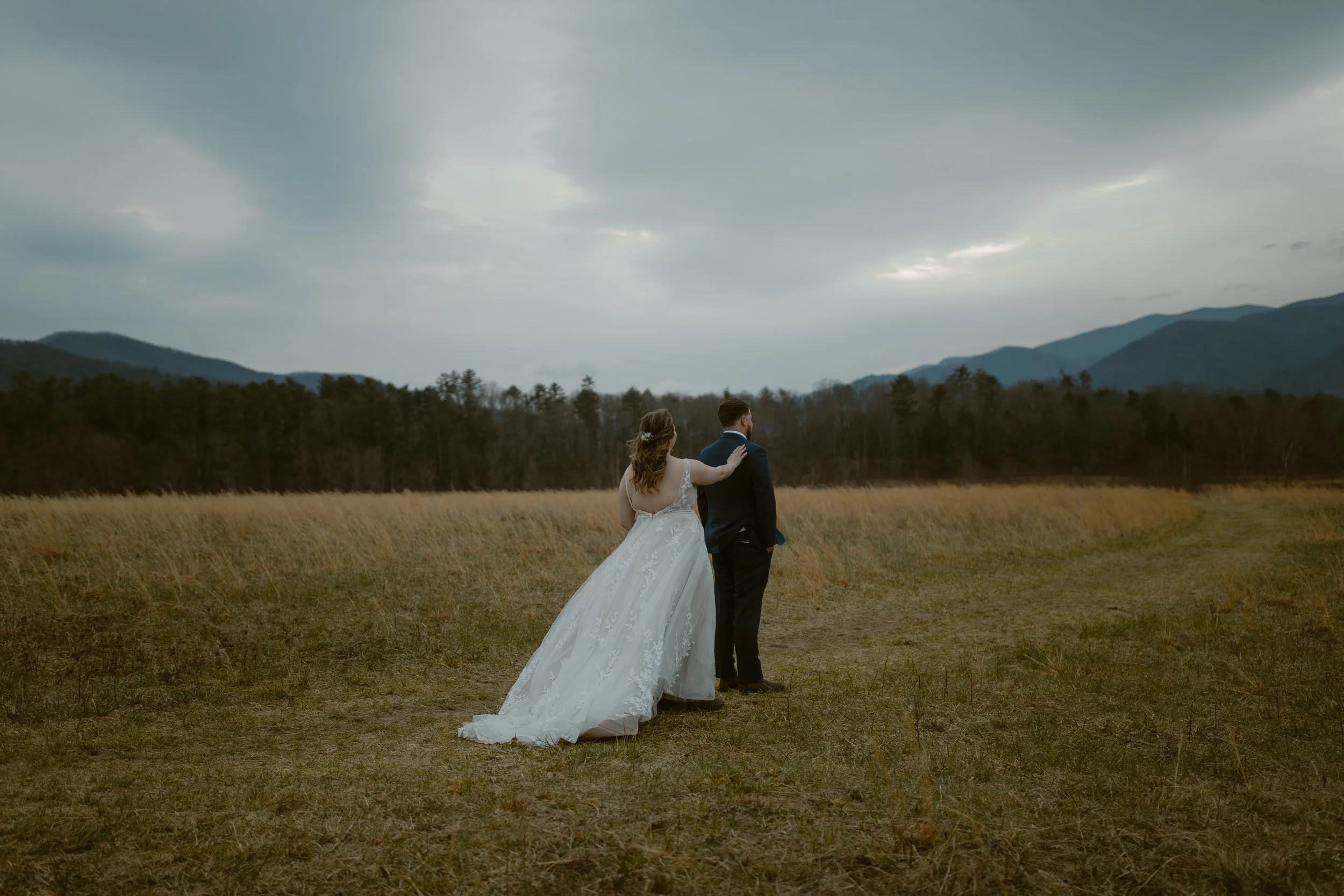 They chose a sunrise ceremony, and even though the morning was cloudy, it was incredibly peaceful with hardly anyone around (honestly, sunrise is the best time to visit Cades Cove if you’re looking for that calm, intimate vibe). They had a cute first look at their ceremony spot. m ,n bOne of their friends gave the sweetest little speech before they exchanged vows, and since we handled their marriage license, it made it so easy for them to include a friend to lead their ceremony.
